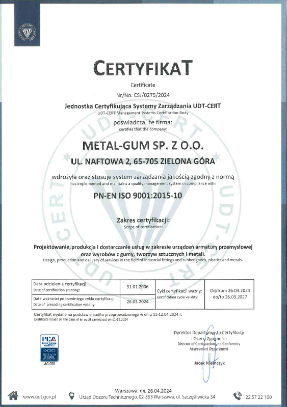 The METAL-GUM company is one of the oldest private production companies in the Zielona Góra region. It started its activity in 1971. At that time, private entrepreneurship was not much popular and respectable as it is today. The company's development accelerated with the year 1980, when cooperation with LZAE LUMEL in Zielona Góra began, and then with the branch FSO - POLMO in Kożuchów. Cooperation with these partners gave our products the rank of quality and responsibility for the materials beeing used. The accuracy of production allowed us to meet another challenge, which became cooperation with KGHM Polska Miedź, under which we began the first work on fittings used in highly abrasive environments. Cooperation with LZAE LUMEL has implemented us into another field – not developed in the 1980s. These were CNC machines that acquainted us with the world of new technologies and aroused the appetite for continuous development of technology and then automation of production processes. Since 2000, the company, has been operating in a different political system, has absorbed proven labor standards and adapted its structures to market requirements. During this time, we have introduced a wide range of products to the market, including products with innovative solutions in their segment.